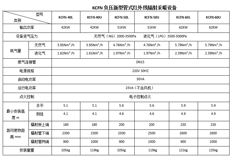 KCFN系列是柯超暖通采用革新技術和高工業標準開發的新一代高效能輻射采暖設備,KCFN系列產品相比傳統型號設備熱效率和輻射效率得到大幅提高,其創新設計的熱交換裝置,更能節省能源消耗。燃燒器的火焰燃燒更均勻,噪音更低,是環保型社會最佳的高大空間采暖選擇,主要部件均獲得歐美CSA、ETL、CE認證。